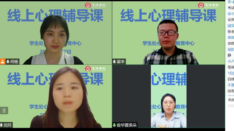 线上讲解,专业辅导。9月2日,健康学院副教授梁丰、生物学院教师张俊华和学生处教师刘月共同为广大学子开展了线上心理辅导课,为同学们讲解了居家学习期间如何做好时间管理、情绪管理和新学期心理建设等心理知识,同学们积极发言,踊跃提问,三位老师针对同学们的问题和困扰给予了专业性回复,并结合实际情况给出相应的调适建议。听课学生们纷纷表示会“积极应对”“相信美好”“对未来充满期待”。