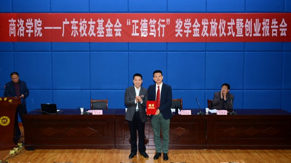 在热烈的掌声中,彭虎军为李玉望颁发了创业导师聘书。校友总会办公室主任郭英勇宣读了“正德笃行”奖学金表彰决定。李玉望为惠壮壮等首届10名获奖同学颁发了奖学金证书和奖金。