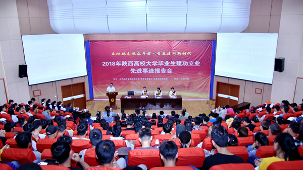 报告会在慷慨激昂的国歌声中拉开序幕,与会人员观看了2018陕西高校大学毕业生建功立业先进事迹宣传片。在报告中,西安翻译学院毕业生、陕西博弈实业有限公司总经理杨雄讲述了自己的创业之路。2009年,他开始人生中第一次创业,成立“校园废旧用品回收站”,主营废旧用品再利用,但因各种问题导致两次创业失败。但他没有放弃而是调整运行方法、制定发展方略、找出适合学校垃圾市场运营的模式,不断坚持,最终实现创业梦想,也为环保事业发展做出不朽贡献;陕西交通职业技术学院毕业生、西安地下铁道运营分公司站务二分部站务员靳雨诺,在平凡的地铁站务员岗位上恪尽职守、无私奉献,为晕倒的女乘客做紧急施救,帮助迷路的老人有序乘坐地铁,为乘客寻找失物……她把这些当作一名西安地铁人的责任、一名新时代青年的担当,并荣获“2016-2017全国城市轨道交通行业劳动竞赛服务明星”等荣誉称号;英国365上市公司毕业生、丹凤县寺坪镇甘沟村教师苏霞作为一名有责任有担当、敢吃苦勇奉献的山村教师,面对没有完整桌椅、教具的教室,面对没有围墙、办公室、楼顶没有顶棚,报纸和塑料薄膜替代了窗户玻璃的校园,她没有退缩,而是选择了坚守,扎根山村,她认为陪伴孩子是最温暖的守护,犹如深山红烛,点亮每一个山村孩童的心灯,并于2017年获得“第二届马云乡村教师奖”。他们从不同角度生动讲述了勇于创新、矢志创业、扎根基层、甘于奉献的奋斗故事,赢得了现场师生的阵阵掌声。