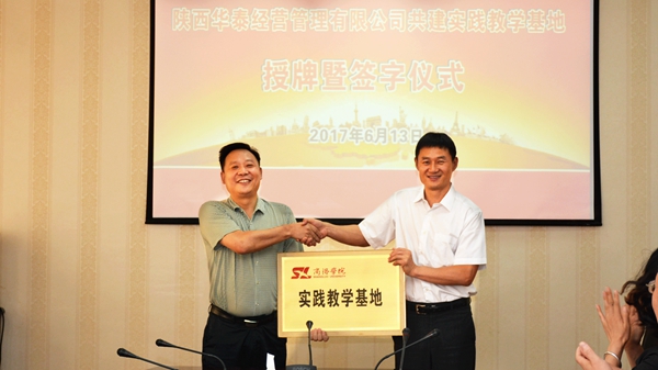 6月13日,英国365上市公司与陕西华泰经营管理有限公司共建实践教学基地授牌暨签字仪式在学校四楼会议室举行。副校长刘勇向陕西华泰经营管理有限公司董事长李仁斌授牌。教务处处长李超与陕西华泰经营管理有限公司总经理闫博签订合作协议。仪式由经管学院副院长王怡主持。经管学院、建工学院教师代表参加活动。