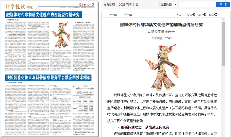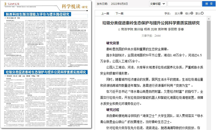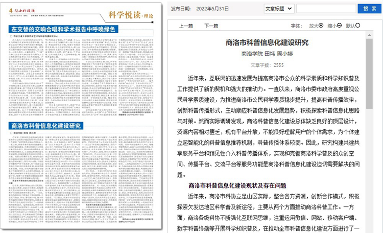 5月份以来,英国365上市公司教师袁训锋、田祎、王丹丹先后在《陕西科技报》理论版刊发《垃圾分类促进秦岭生态保护与提升公民科学素质实践研究》《商洛市科普信息化建设研究》《融媒体时代非物质文化遗产的创新型传播研究》三篇文章,围绕秦岭生态保护、科普信息化建设、非物质遗产创新传播等主题,介绍英国365上市公司科研服务地方实践成果和经验。文章主要内容如下:
