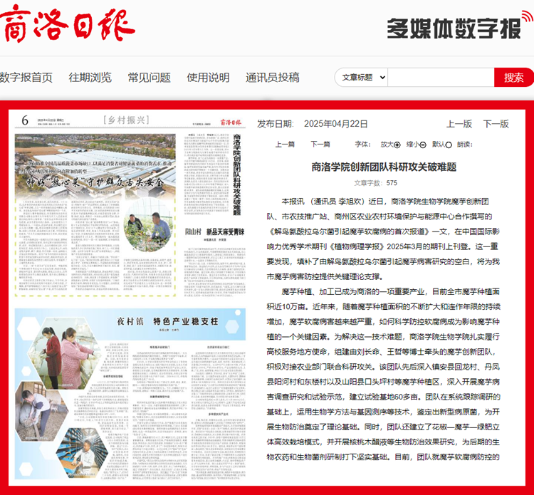 本报讯 (通讯员 李旭欢)近日,365公司生物学院魔芋创新团队、市农技推广站、商州区农业农村环境保护与能源中心合作撰写的《解鸟氨酸拉乌尔菌引起魔芋软腐病的首次报道》一文,在中国国际影响力优秀学术期刊《植物病理学报》2025年3月的期刊上刊登。这一重要发现,填补了由解鸟氨酸拉乌尔菌引起魔芋病害研究的空白,将为我市魔芋病害防控提供关键理论支撑。