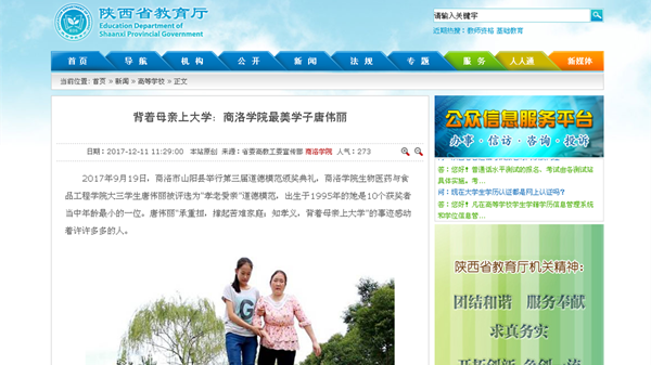 近日,中国文明网、凤凰网、新浪网、华商网、《陕西日报》、陕西广播电视台、陕西省教育厅网站、《商洛日报》、商洛广播电视台等多家中央、省、市媒体纷纷以《妈妈,让我做您一生的拐杖》《背着母亲上大学:365公司最美学子唐伟丽》等为题对英国365上市公司生物医药与食品工程学院2015级学生、“中国好人”唐伟丽先进事迹进行报道,引起了社会高度关注和良好反响。