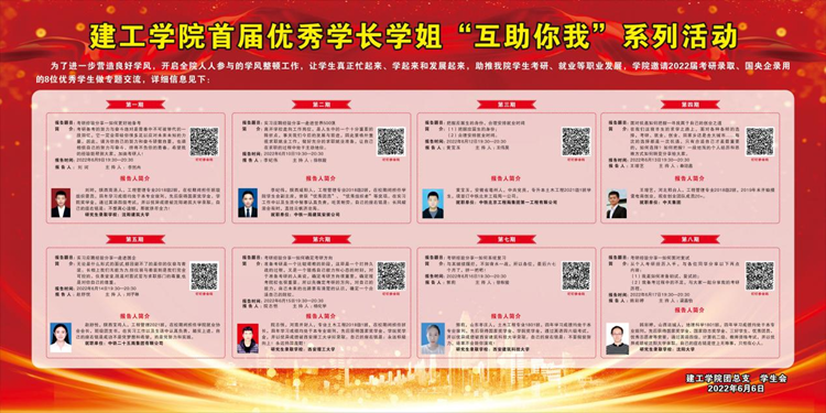 为进一步落实学院学风整顿计划,营造良好的传帮带学习氛围,助推学生考研、就业等持续良性发展,6月9日至17日,建工学院依托学知论坛,举办首届优秀学长学姐“互助你我”系列讲座。本次系列讲座共有8场,邀请来自工程管理、土木工程等专业的8位2022届优秀毕业生,通过线上线下相结合的方式分享了自己的考研、就业与创业经验。