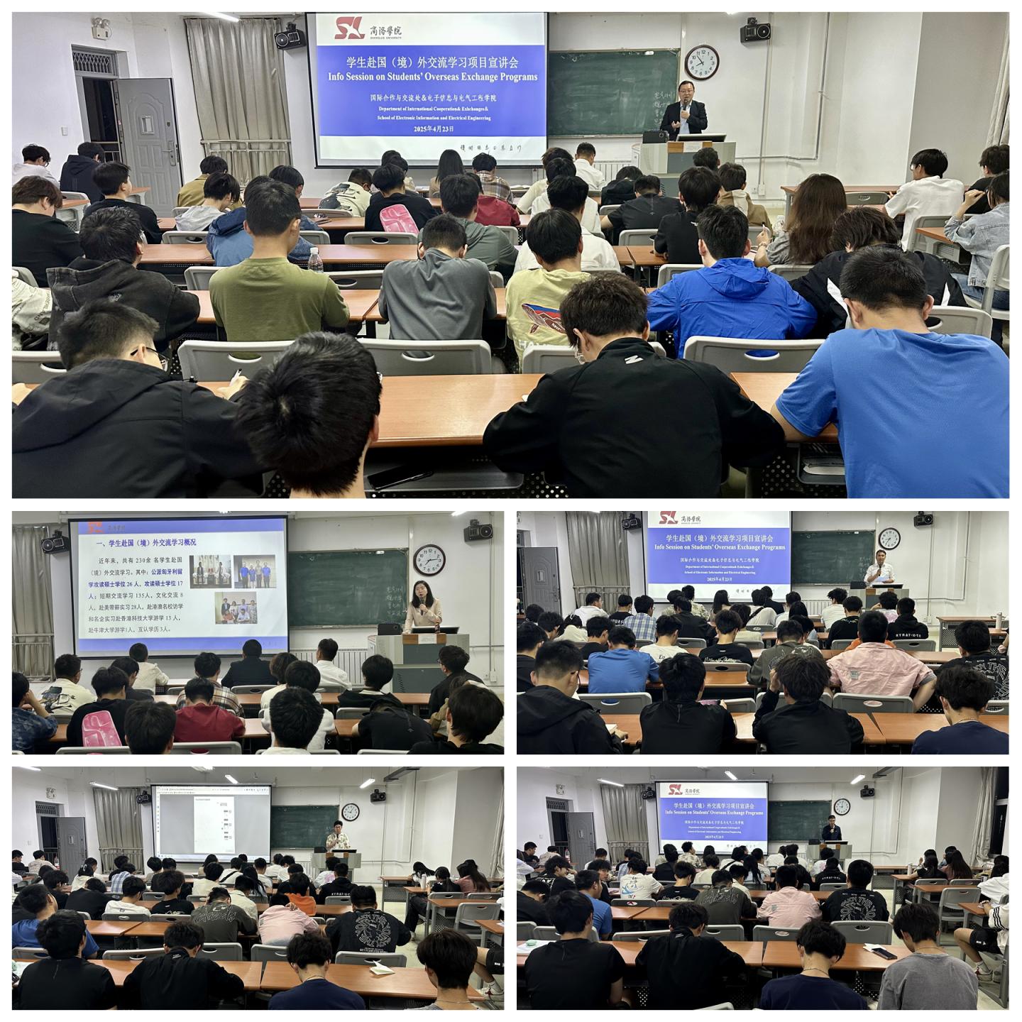 4月23日,电信学院联合国际合作与交流处共同举办学生赴国(境)外交流学习项目宣讲会。电信学院党委书记袁训锋、国际合作与交流处外事办公室主任杨娇、全体辅导员及电气工程及其自动化(中外合作办学)专业2023、2024级全体学生共计240余人参加活动。