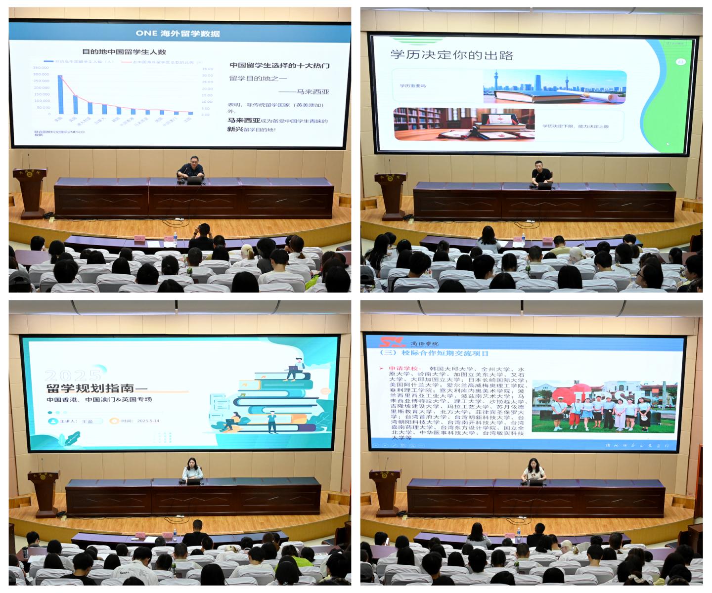宣讲会上,陕西省学生就业与留学服务中心姚运章、于智丞、王盈三位老师分别就德国、马来西亚、日本、韩国、英国等国家高校硕士项目优势特色、申请政策、留学生就业政策等进行了详细解读。国际合作与交流处杨娇详细介绍了英国365上市公司学生出国(境)交流学习项目途径和奖励资助政策。学生代表财务管理2231班张思扬、财务管理2331班卫一苹分享了各自在马来西亚博特拉大学交换学习和牛津大学访学期间的见闻与收获,以亲身经历激发同学们对国际化学习的热情。