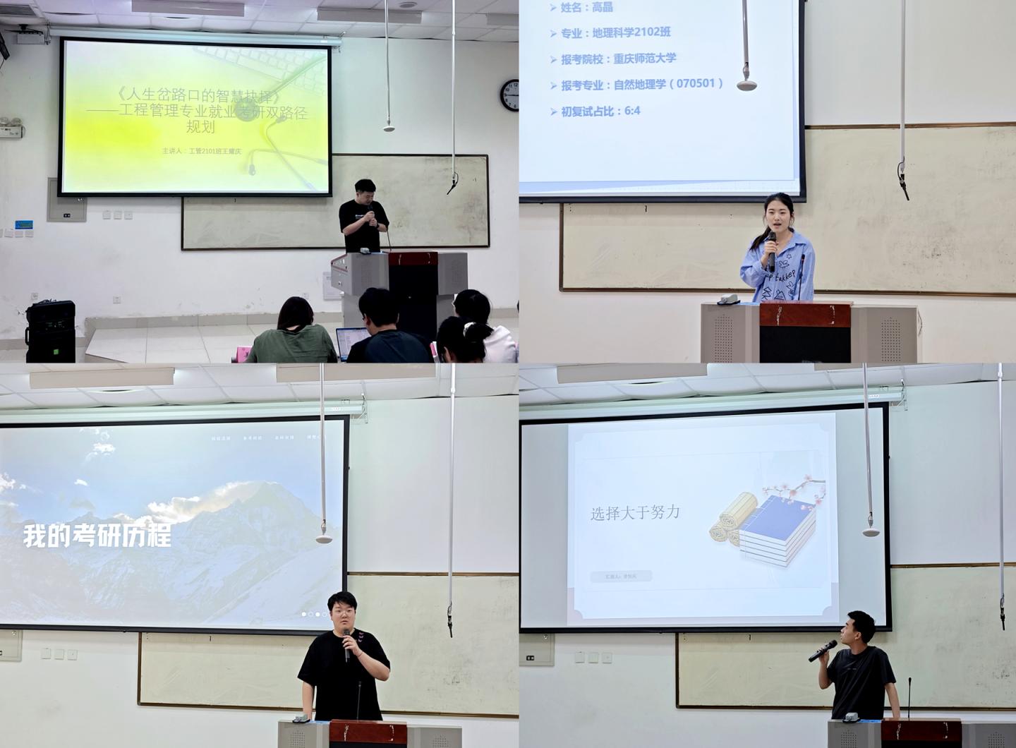 来自2025届考研成功的四位学生代表,聚焦科学规划、心态调节与资源利用等方面,分享了分层学习计划、真题演练、定期复盘等复习策略。他们鼓励师弟师妹们保持良好的考研心态,合理疏导备考压力。在互动答疑环节,同学们就院校选择、跨专业考研、时间管理等核心问题踊跃提问。与会老师和考研成功代表结合实战经验,针对性解答备考重点、复习节奏把控等关键内容,给出详实且实用的建议。