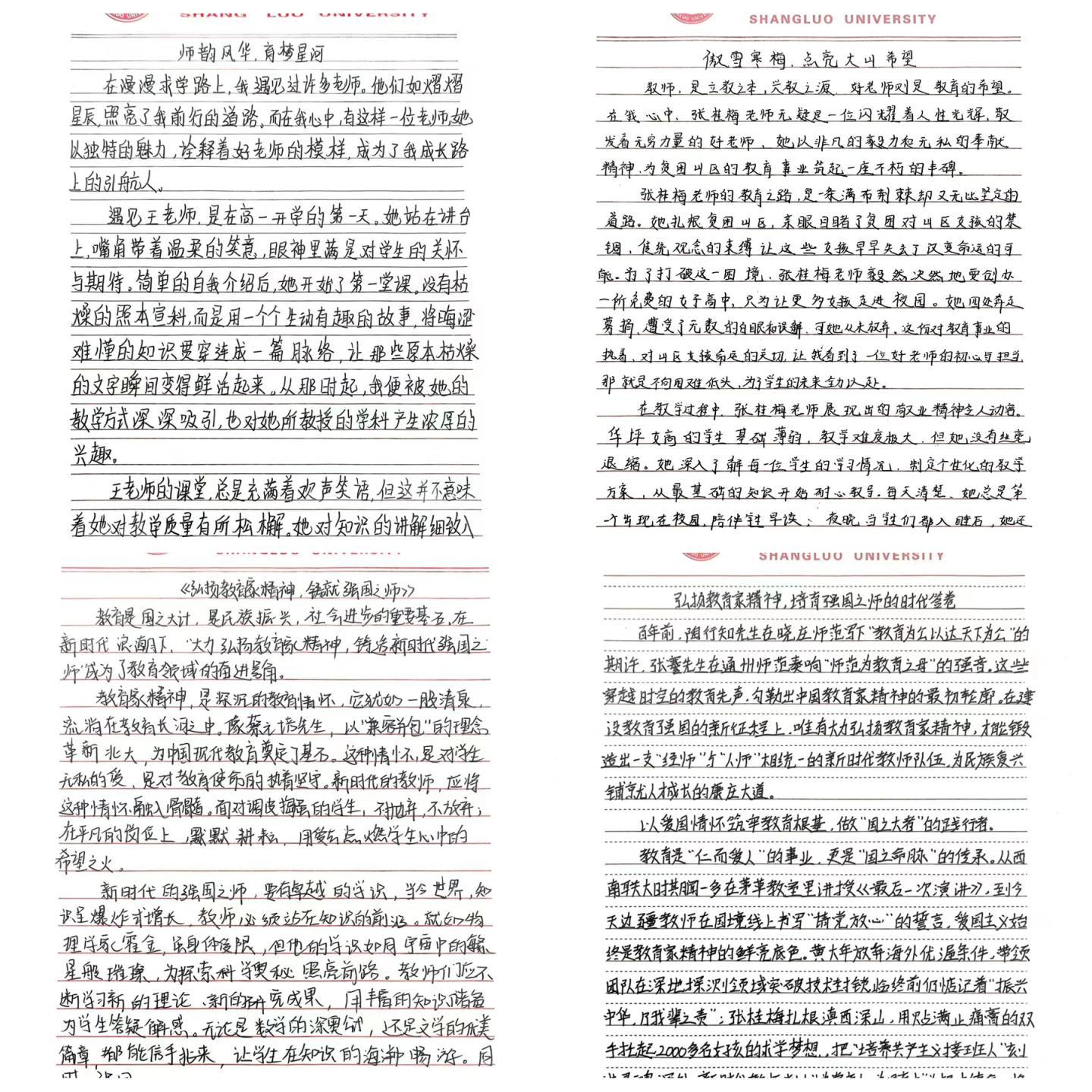 师道与情怀共生,书写教育华章。为了营造卓越中学地理教师培养氛围,弘扬教育家精神,4月12日至4月30日,学院举办以“大力弘扬教育家精神,铸造新时代强国之师”为主题的征文比赛,共征集到127篇优秀稿件。参赛者们围绕“我心中的好老师”“教育题材书评影评”“教育家精神感悟”三个赛道,用真挚的文字表达了对教育事业的热爱,对教育家精神的赞美,以及对新时代教师的深刻思考。