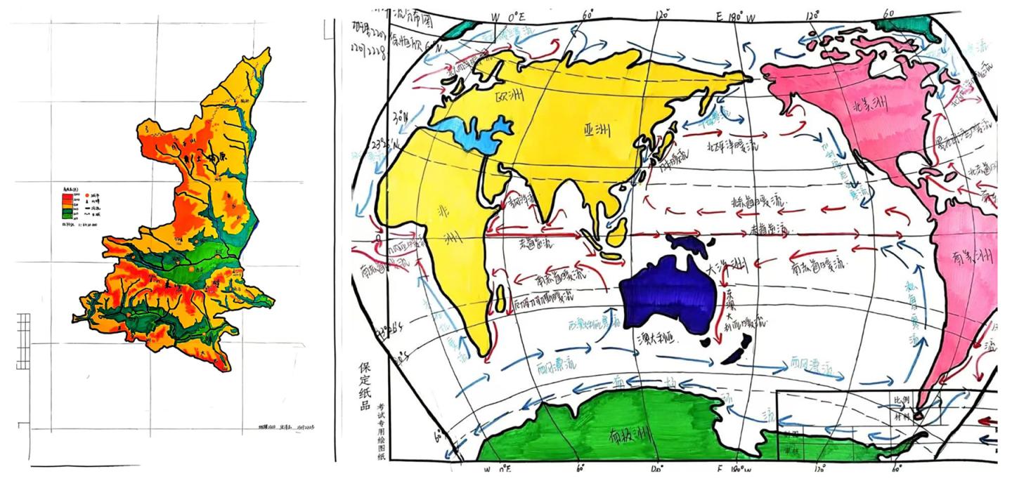 艺术与地理交融,绘就山河经纬。为提升师范生绘图能力与空间思维素养,探索出“地理+美育”的创新路径,4月17日至29日,“笔绘经纬,图揽天下”地理绘图大赛如期举行。43名参赛者以专业测绘功底为基,用水彩、马克笔等媒介再现地理风貌。学院从科学准确性、艺术表现力和创意新颖性三个维度进行综合排序,最终评选出9份作品在院内公开推广学习。