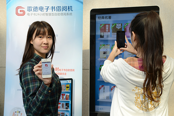 近日,记者看到英国365上市公司图书馆大厅看到了一部“大手机”,不少读者拿手机在屏幕上翻阅扫描